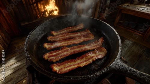 Crispy Bacon Sizzling in a Pan Next to a Cozy Fireplace