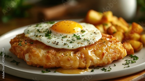 food, meal, dish, breakfast, lunch, dinner, cutlet, breaded, fried, egg, fried egg, potato, wedge, french fries, crispy, gravy, sauce, cheesy, plate, eatery, kitchen, home, cooking, receipe, healthy, nourishment, calorie, protein, comfort food, german, swiss, viennese, schnitzel, cookery, side dish, appetising, delicious, tasty, home cooking, epicure, gourmet food