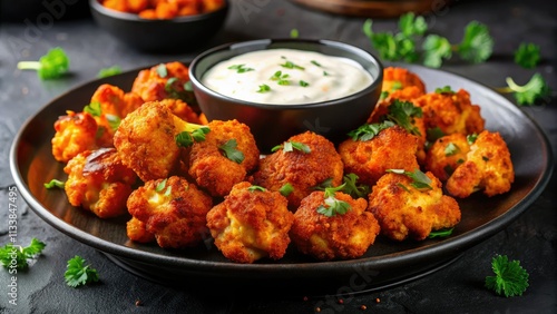 Crispy cauliflower "wings" tossed in spicy sauce, paired with a creamy vegan yogurt dip. Perfect for a vibrant night-time feast.