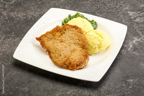 schnitzel, chicken, roasted, meat, meal, fried, food, dinner, cutlet, pork meat, fillet, dish, chop, cooked, plate, lunch, breaded, tasty, veal, delicious, sirloin, steak, fresh, wiener, cookery, german, potato, escalope, crumb, closeup