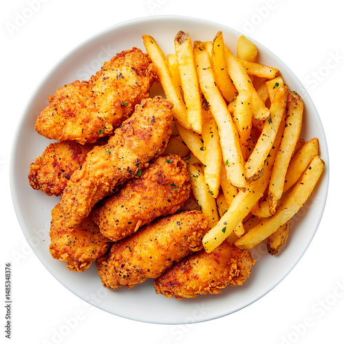 Crispy chicken strips with French fries in a white plate, isolated on a white background