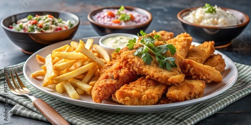 Crispy Chicken Tenders and French Fries on a plate with Coleslaw in a bowl