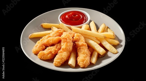 food, meal, dinner, lunch, fries, potato, chicken, crispy, crunchy, ketchup, sauce, plate, dish, tasty, delicious, deliciously, snack, fast, junk, comfort, american, classic, eatery, cafes, pub, home, cooking, kitchen, eat, eating, fresh, hot, gold, brown, white, red, grey, isolated, background, black, studio, photo, image, picture, view, top
