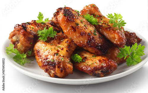 Crispy chicken wings glistening on white plate garnished with fresh parsley, creating an appetizing and savory food photography scene.