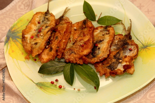 Crispy deep fried small fish on a plate, decorated with bay leaves and spices. Dough herring. Herring recipes