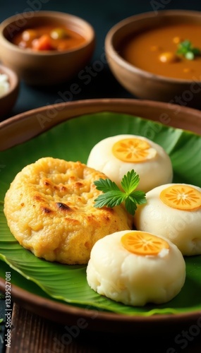 Crispy dosa, fluffy idli, vibrant sambar, chutney, banana leaf setting, home cooking, Idli