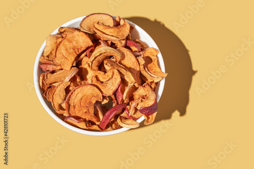 Crispy dried food. Organic tasty chips. Homemade snacks. Sliced apples. Healthy fruit.
