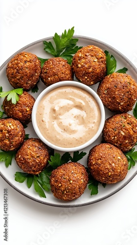Crispy Falafel Balls with Creamy Dip and Fresh Parsley Garnish, Overhead View