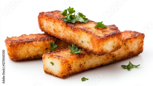 Crispy fish finger sticks garnished with fresh parsley on white background