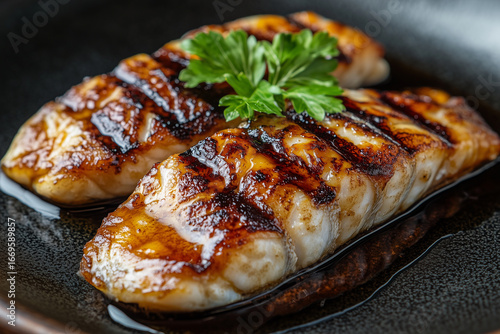 grilled fish, seafood, culinary, epicure, healthy eating, garnished, parsley, savoury, delicious, food, asian cuisine, appetising, black plate, fine dining, home cooking, culinary arts, nourishment