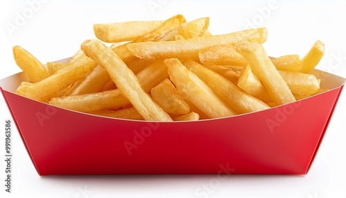Crispy French Fries in Red Container Isolated on White Background, Clipping Path, Full Depth of Field
