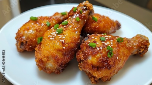 Crispy fried chicken drumsticks garnished with green onions served on a white plate, showcasing a delicious meal