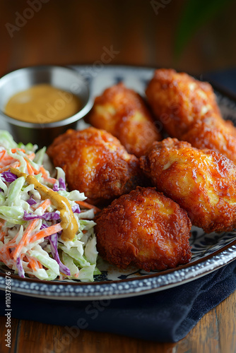 Crispy fried chicken pieces served with coleslaw and mustard sauce.