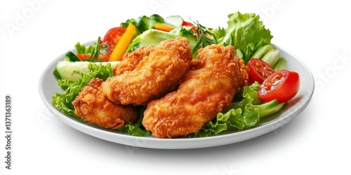 Crispy fried chicken tenders served with fresh salad and vegetables on a white plate