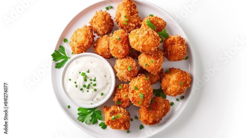 Crispy fried nuggets with crumb coating served beside white dipping sauce on a white plate isolated on white background Top view