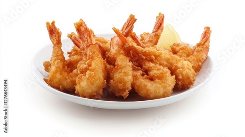 Crispy fried shrimp on white plate with lemon slice - delicious seafood appetizer
