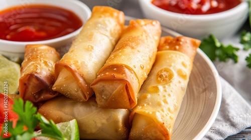 spring roll, fried, crispy, asian cuisine, chinese food, dish, food, herb, fresh, cilantro, mint, lime, plate, serving, snack, delicious, golden brown, savoury, traditional, cookery, epicure, eatery, closeup, studio shot, still life, party food, finger food