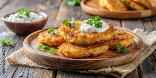 Crispy Gluten-free Potato Fritters with Cottage Cheese on a Wooden Plate, crispy exterior