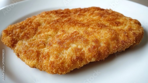 Crispy golden breaded cutlet served on a white plate showcasing its crunchy texture and appetizing color.