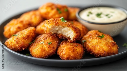 Crispy golden chicken nuggets with tangy dipping sauce served on a black plate against a neutral backdrop