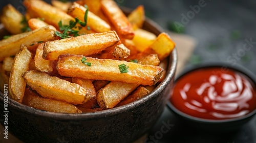 Crispy Golden French Fries in Rustic Metal Bowl with Ketchup - Delicious Fast Food Concept in Medium Shot Photo