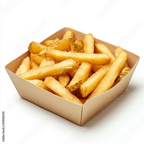 Crispy golden french fries served in a brown paper carton on a clean white background perfect for fast food concepts.