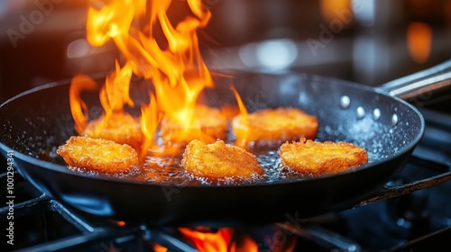 Crispy golden fried snacks in a sizzling pan, creating flames as they cook. Perfect for culinary illustrations and food preparation imagery.