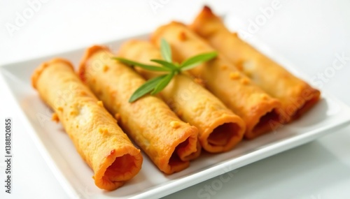 Crispy golden spring rolls, neatly arranged, minimalist white backdrop, image, studio shot, clean