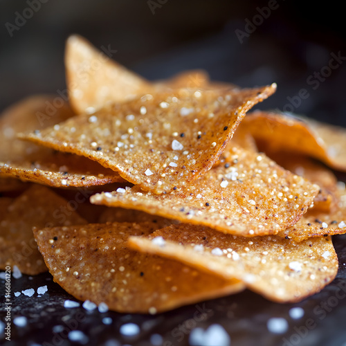 Crispy homemade tortilla chips seasoned with salt on a dark wooden surface ready for snacking