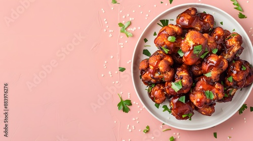 cauliflower, crispy, bite, snack, vegan, vegetarian, healthy, food, dinner, lunch, receipe, delicious, savoury, sweet, sauce, garnish, parsley, pink, background, white, plate, topview, overhead, food photography, cooking, healthy eating, diet, weight loss, protein, carb, vegetable, healthy snack, tasty, flavorful, home cooking, epicure