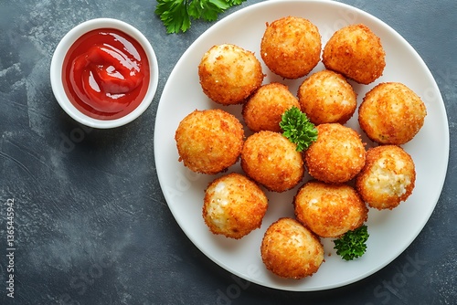 Crispy Potato Croquettes with Mozzarella Cheese, Deep-Fried and Served with Ketchup
