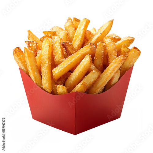 Crispy salted French fries in red carton box, delicious snack png isolated on transparent background