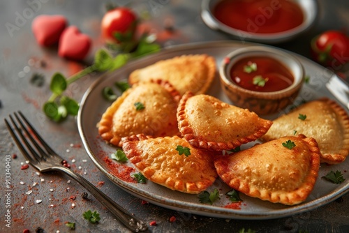 dumpling, savoury, fried, crispy, sauce, spicey, snack, herb, plate, food, dining, cookery, epicure, delicious, culinary, homemade, fresh, meal, party, share, texture, favor, ingredient, traditional, cooking, receipe, table, tomatoes, condiment, garnish, spice, serve, round, gold, bite, enjoyment, gathering, plating