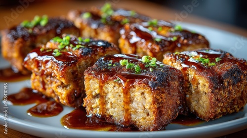 Crispy seitan pieces drizzled with rich sauce on a plate garnished with green onions