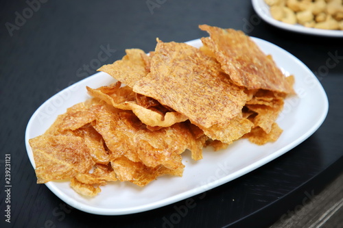 crispy sliced pork in white plate On the black wood table
