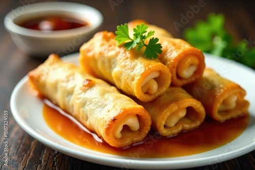 Crispy spring rolls on white, surrounded by soy sauce, image, crispy