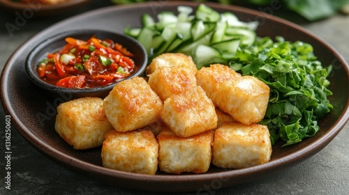 Crispy Tofu Cubes with Cucumber Salad and Sauce