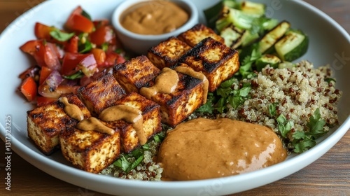Crispy tofu skewers with smoky peanut glaze and grilled vegetables