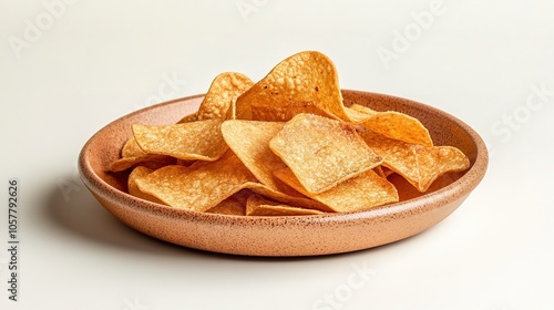 Crispy Tortilla Chips on Ceramic Plate Against White Background.