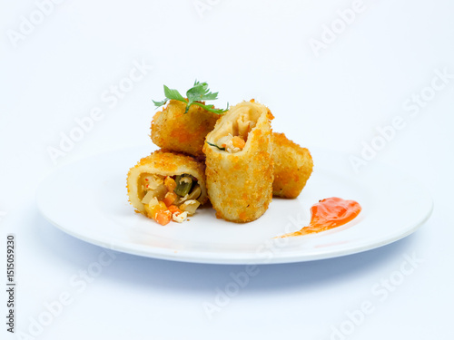 Crispy vegetable risol cut open on a white plate, served with chili sauce. isolated on white background