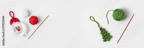 crocheted, toy, santa, claus, red, hat, green, christmas, tree, ball, thread, crochet, hook, grey, background, baby, accessory, gift, winter, holiday, top, view, flat, lay, knitted, knit up, cute, set, object, decoration, hand-made, home, fashion, creative, topview, children, hobby, purchase, colours, beautiful, funny, children, homemade, children, bricolage, wool, avocation