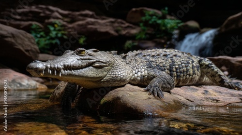 Crocodile Relaxing on Rock Near Waterfall in Lush Green Forest Setting