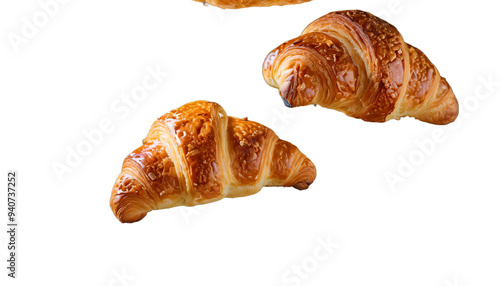 Croissants that fresh and delicious falling in the air isolated on background, Breakfast time, popular plain croissant breads.