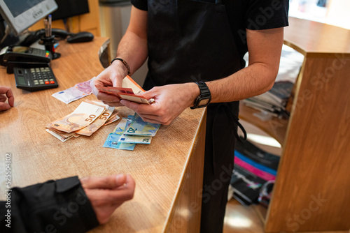 cashier, client, money, count, shop, counter, work, cash, euro, modern, job, finance, payment, buy, store, client, retail, small business, staff, employee, consumerism, purchase, salesman, service, commerce, contemporary, bunch, many, banknote, change, table, horizontal, indoor, crop, faceless, unrecognizable, anonymous, from above