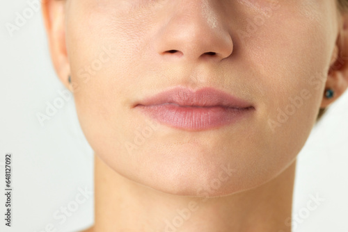 Cropped image of female face, nose, lips and chin isolated on white background. Plastic surgery, filler, lip augmentation. Concept of natural beauty, cosmetology and cosmetics, skin care, spa. Ad
