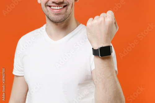 Cropped image of smiling cheerful young man 20s in basic casual empty blank white t-shirt standing wearing smart watch on hand isolated on bright orange colour background studio portrait.