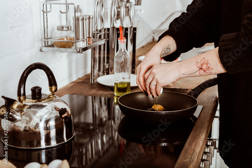 cropped image of woman with tattooed hand making eggs on breakfast at home