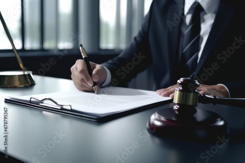 Cropped photo of a lawyer signing documents in court. Law and order in the form of perfect documentation.