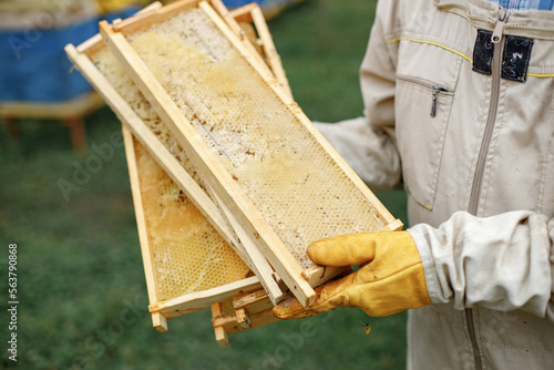 Cropped photo of honeycomb frame in hands of beekeeper on the apiary