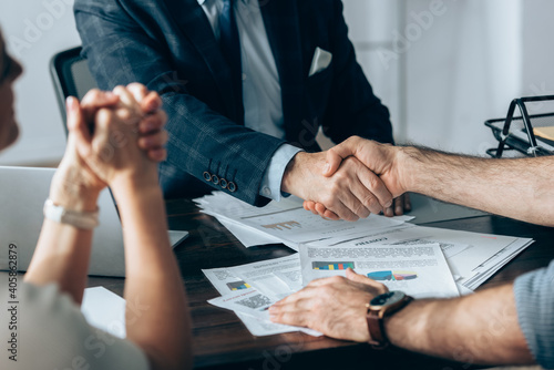 Cropped view of businessman shaking hand with investor near colleague and papers on table